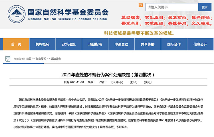 11月30日,國家自然科學(xué)基金委員會公布《2021年查處的不端行為案件處理決定(第四批次)》,通報批評5起不端行為案件處理決定(網(wǎng)絡(luò)發(fā)布版),共有 5 名學(xué)者受到處罰。