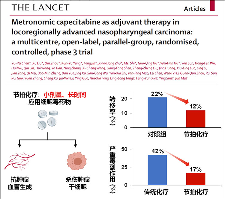 中山大學腫瘤防治中心馬駿研究團隊提出了小劑量、長時間口服細胞毒藥物卡培他濱的節(jié)拍化療模式,其可通過抗血管生成、殺傷腫瘤干細胞等機制持續(xù)抑制腫瘤,同時提高機體耐受性。馬駿教授通過牽頭一項多中心、前瞻性臨床研究發(fā)現(xiàn),在放療后使用“卡培他濱節(jié)拍化療”可將失敗風險顯著降低45%,且嚴重毒副作用發(fā)生率減少了3/5,完成率達74%。同時卡培他濱口服用藥方便可及,易于向基層推廣。