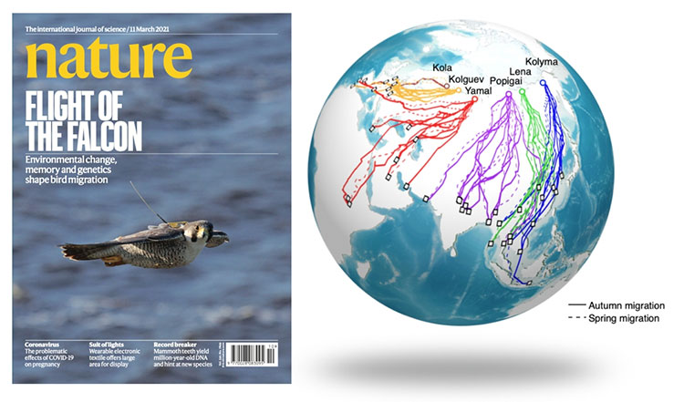 中國科學院動物研究所詹祥江團隊歷時12年,通過整合多年衛(wèi)星追蹤數(shù)據(jù)和種群基因組信息,建立了一套大陸尺度的的北極游隼(Falco peregrinus)遷徙研究系統(tǒng)。研究人員闡明了氣候變化在鳥類遷徙路線形成、維持及未來變化趨勢中的驅動作用,發(fā)現(xiàn)一個和記憶能力相關的基因ADCY8在遷徙距離更長的游隼種群中受到正選擇,揭示了長時記憶可能是鳥類長距離遷徙的重要基礎。該研究全面結合遙感衛(wèi)星追蹤、基因組學、神經(jīng)生物學等新型研究手段,展現(xiàn)了學科交叉型的創(chuàng)新性研究在回答重大科學問題中的關鍵作用。