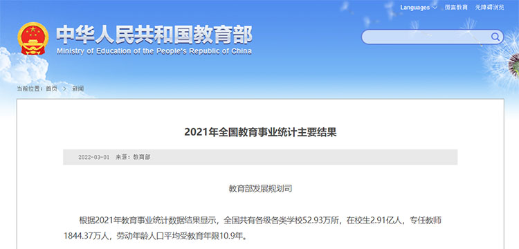 2021年,全國共有高等學校3012所,其中,普通本科學校1238所;本科層次職業(yè)學校32所;高職(專科)學校1486所;成人高等學校256所。各種形式的高等教育在學總規(guī)模4430萬人,高等教育毛入學率57.8%。