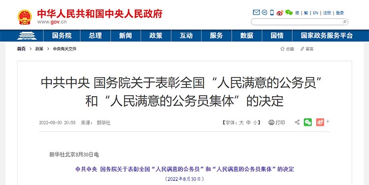 8月30日,中共中央 國務(wù)院發(fā)布關(guān)于表彰全國“人民滿意的公務(wù)員”和“人民滿意的公務(wù)員集體”的決定。