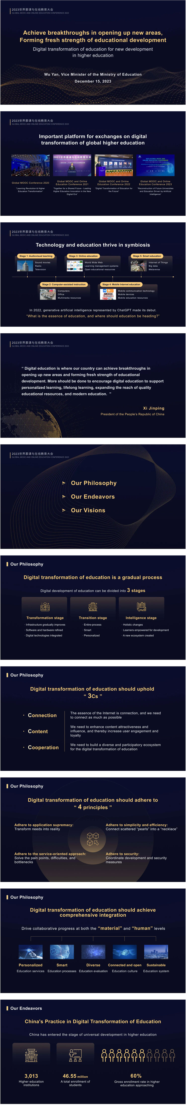 2023年12月15日,教育部副部長吳巖出席世界慕課與在線教育大會,并作題為《開辟新賽道,尋求新突破——教育數(shù)字化引領(lǐng)高等教育新發(fā)展》的主旨報(bào)告(英文原標(biāo)題為:Achieve breakthroughs in opening up new areas, Forming fresh strength of educational development —— Digital transformation of education for new development in higher education)。以下為PPT全文。