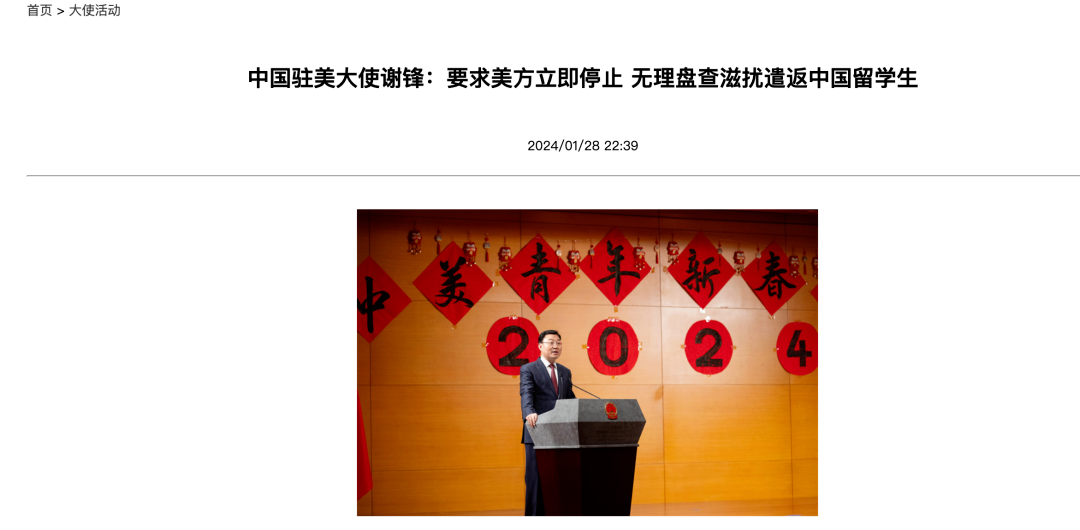 中國(guó)駐美國(guó)大使館高度重視維護(hù)中國(guó)留學(xué)人員安全和合法權(quán)益,已就此向美方提出嚴(yán)正交涉。美方頻繁對(duì)中國(guó)留學(xué)人員無(wú)端盤查甚至遣返,嚴(yán)重?fù)p害中國(guó)公民正當(dāng)合法權(quán)益,與中美元首舊金山會(huì)晤關(guān)于促進(jìn)兩國(guó)人文交流的共識(shí)背道而馳。我們強(qiáng)烈敦促美方停止錯(cuò)誤做法,停止無(wú)端滋擾、盤查、遣返中方留學(xué)人員,切實(shí)將兩國(guó)元首關(guān)于支持中美人文交流,鼓勵(lì)擴(kuò)大留學(xué)生規(guī)模的共識(shí)落到實(shí)處。