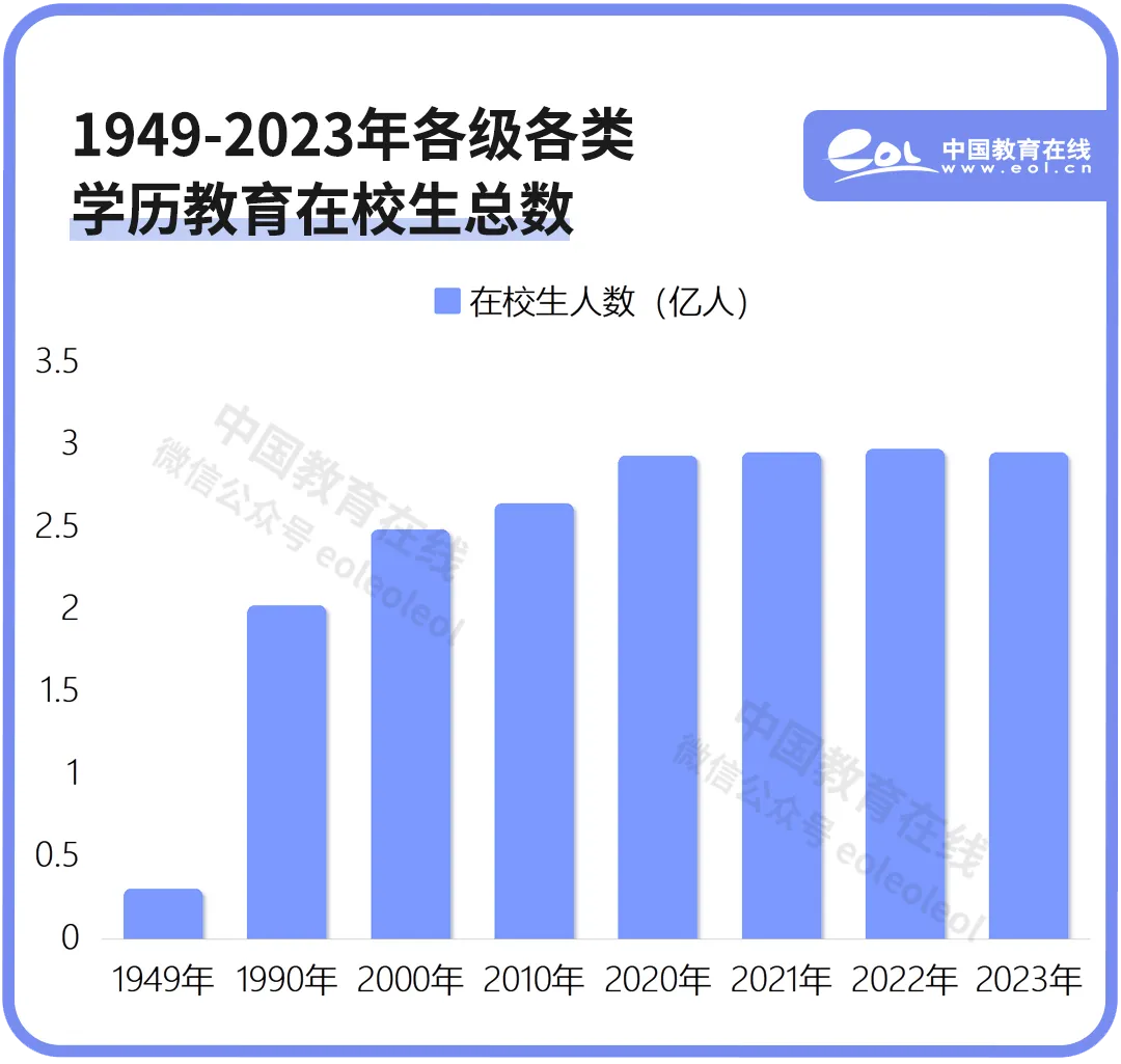 2023年,據(jù)教育事業(yè)統(tǒng)計數(shù)據(jù)顯示,全國共有各級各類學校49.83萬所,有2.91億學歷教育在校生,占人口總數(shù)的20.6%。