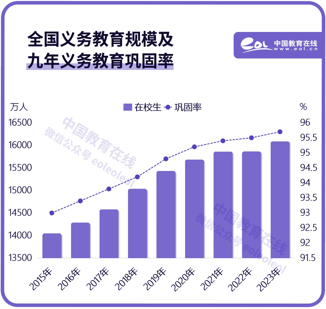 2015年,義務(wù)教育鞏固率為93%,到2023年,九年義務(wù)教育鞏固率95.7%,比2015年提高了2.7個百分點,義務(wù)教育擴優(yōu)提質(zhì)進一步推進。