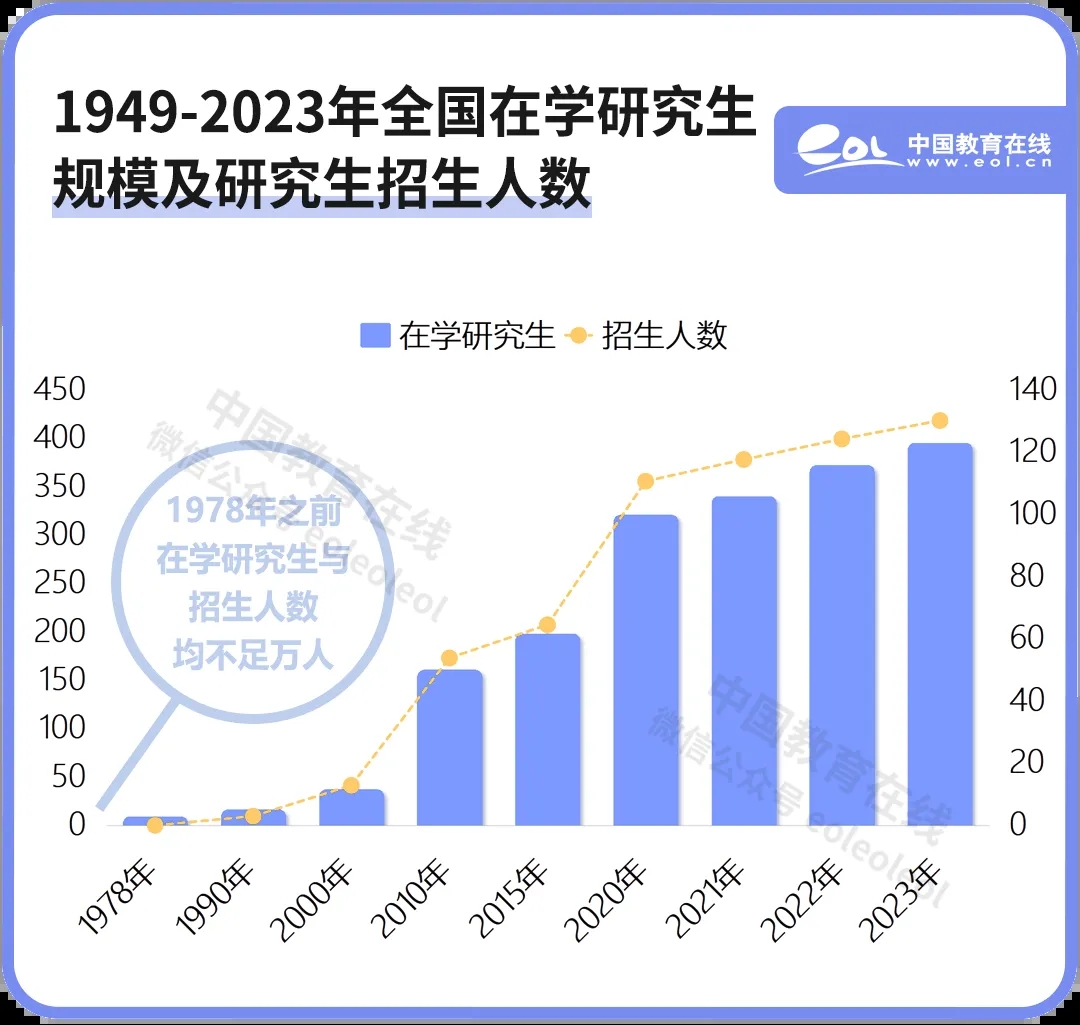 1949年,我國研究生在學人數(shù)僅為629人;到1978年突破萬人;1993年突破十萬人,2006年突破百萬人,2020年,研究生在學規(guī)模突破300萬大關(guān),2023年達到388萬人。