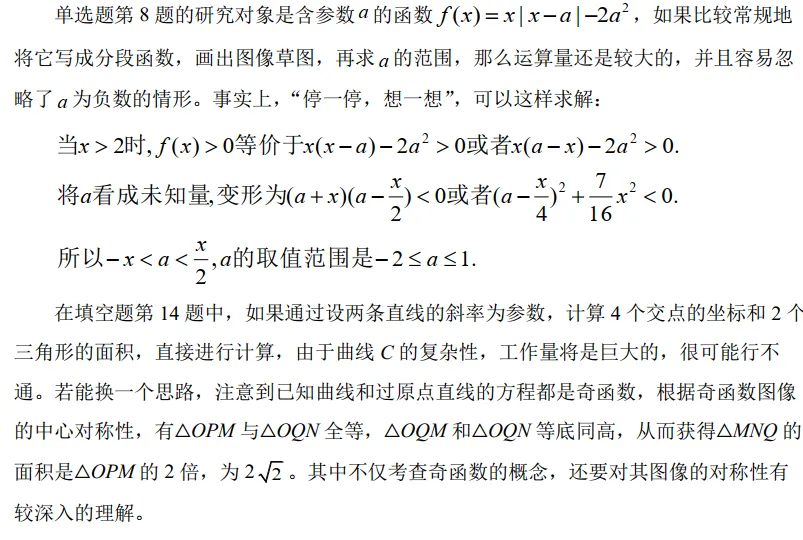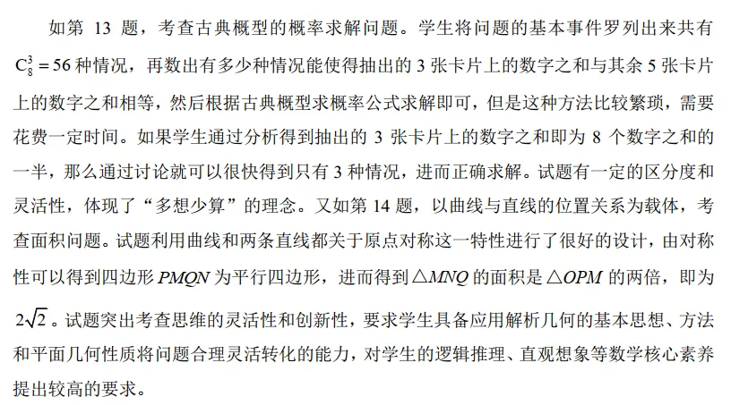 未來的高考要區(qū)分出真正具備數(shù)學(xué)素養(yǎng)、思維能力強(qiáng)的學(xué)生,而不是靠熟練度只會做套路題目的學(xué)生。測試卷表明,考生應(yīng)該改變原有的應(yīng)考觀念,走出“多刷題、算得快”的誤區(qū)。也可以看出,通過選擇行之有效的方法簡化計(jì)算,讓考生能夠有充分的時間進(jìn)行思考,仍然是今后高考數(shù)學(xué)將堅(jiān)持的改革方向。