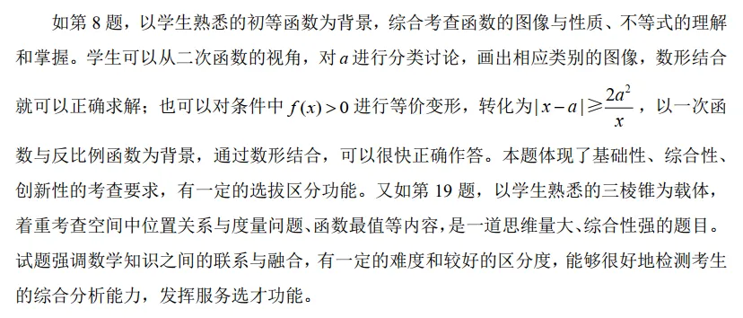 測試卷符合“依標(biāo)命題、源于教材”的命題理念,強(qiáng)化與課標(biāo)、教材的銜接,引導(dǎo)一線教學(xué)回歸課標(biāo)、回歸課堂主渠道,引導(dǎo)一線教學(xué)講透教材內(nèi)容,注重減量提質(zhì),與高中數(shù)學(xué)教學(xué)同向同行、同頻共振,對數(shù)學(xué)高考改革又做了一次有益的嘗試,對教育評價具有積極的導(dǎo)向作用。