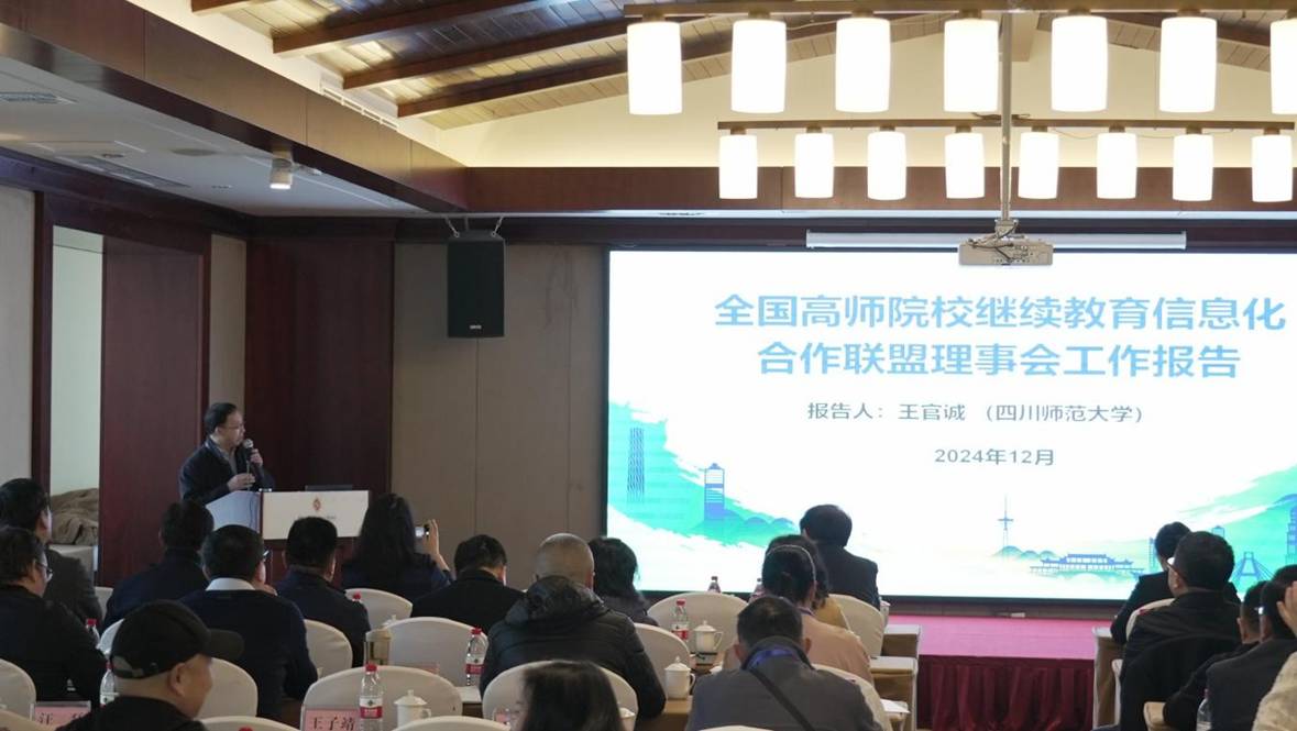 聯(lián)盟輪值理事長單位、四川師范大學(xué)繼續(xù)教育學(xué)院院長王官誠代表聯(lián)盟理事會作工作報(bào)告。報(bào)告回顧了2024年聯(lián)盟開展的主要工作,包括持續(xù)更新升級支持服務(wù)平臺、完善課程共建共享機(jī)制、成立聯(lián)盟專家委員會等,并對2025年聯(lián)盟的主要工作計(jì)劃進(jìn)行了介紹,包括增加11-15所省屬師范大學(xué)作為聯(lián)盟副理事長單位(常務(wù)理事單位),開展2025年度繼續(xù)教育工作先進(jìn)集體和先進(jìn)個人評選等工作。