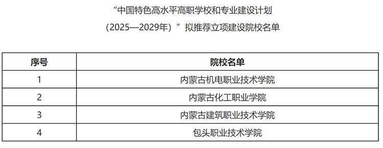 2月19日,內(nèi)蒙古自治區(qū)教育廳發(fā)布《關(guān)于“中國特色高水平高職學校和專業(yè)建設計劃(2025—2029年)”擬推薦立項建設院校的公示》。