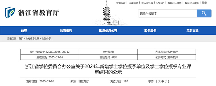 3月5日,浙江省學(xué)位委員會(huì)辦公室公示了2024年新增學(xué)士學(xué)位授予單位及學(xué)士學(xué)位授權(quán)專業(yè)評(píng)審結(jié)果。