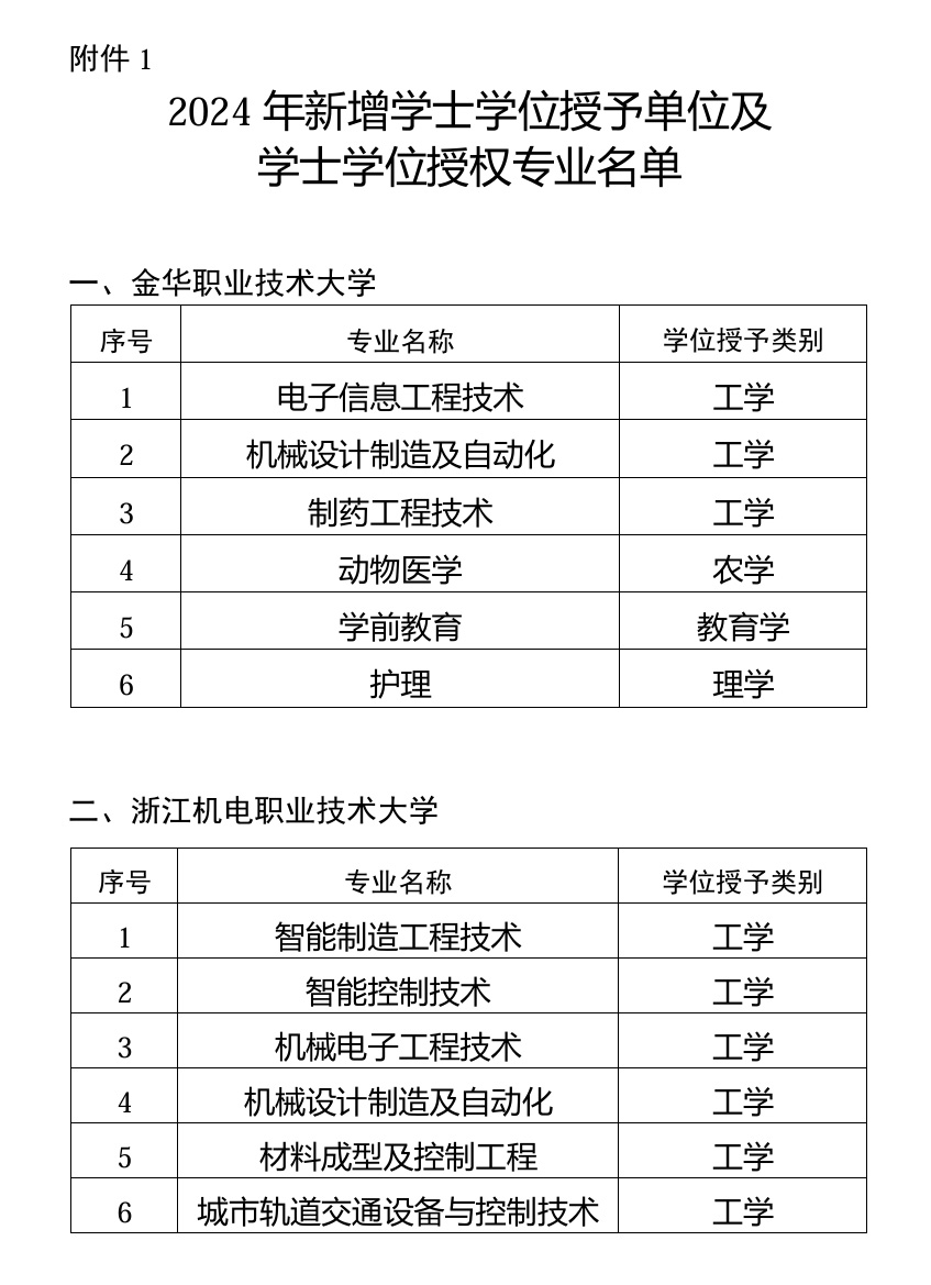 經(jīng)學(xué)校申報(bào)、專家評(píng)審、省學(xué)位委員會(huì)審議,擬新增金華職業(yè)技術(shù)大學(xué)為學(xué)士學(xué)位授予單位,其電子信息工程技術(shù)等6個(gè)專業(yè)為學(xué)士學(xué)位授權(quán)專業(yè);新增浙江機(jī)電職業(yè)技術(shù)大學(xué)為學(xué)士學(xué)位授予單位,其智能制造工程技術(shù)等6個(gè)專業(yè)為學(xué)士學(xué)位授權(quán)專業(yè);新增浙江工商大學(xué)“日語-國際商務(wù)”雙學(xué)士學(xué)位專業(yè)1個(gè);新增浙江大學(xué)生物育種科學(xué)等68個(gè)專業(yè)(含第二學(xué)士學(xué)位專業(yè)3個(gè)、建筑學(xué)專業(yè)學(xué)位專業(yè)1個(gè))為學(xué)士學(xué)位授權(quán)專業(yè)。