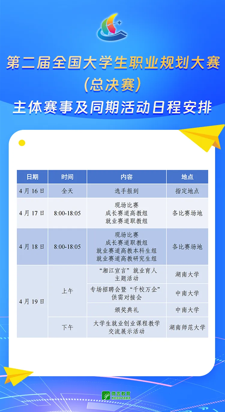 第二屆全國大學(xué)生職業(yè)規(guī)劃大賽總決賽將于4月16日至19日在湖南省長沙市舉辦。
