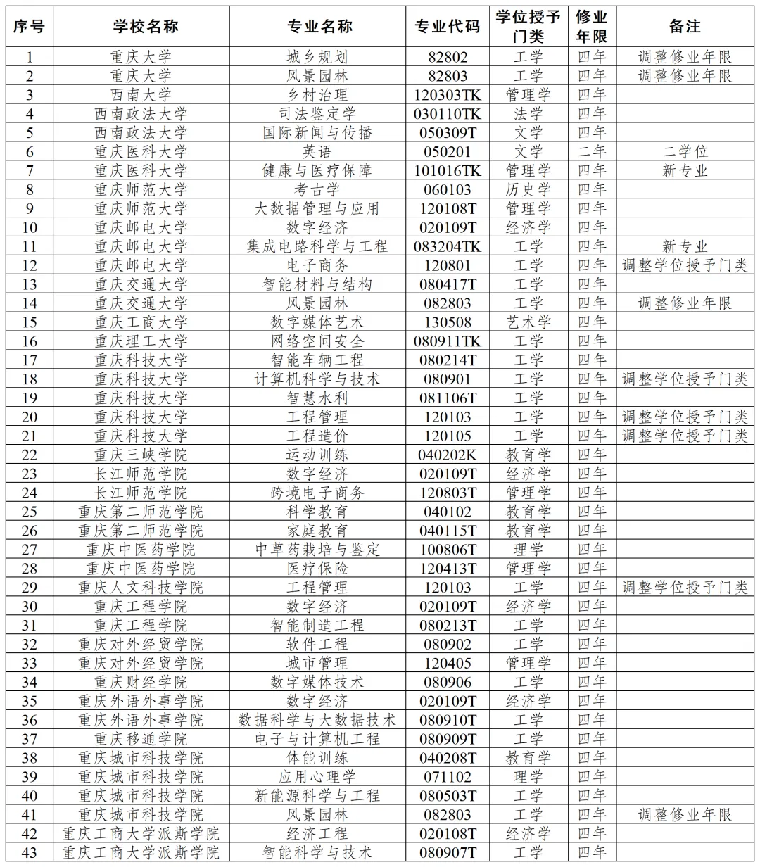 本次專業(yè)增設(shè)充分體現(xiàn)服務(wù)國家戰(zhàn)略和區(qū)域經(jīng)濟(jì)社會(huì)發(fā)展需求導(dǎo)向,在服務(wù)健康中國、西部陸海新通道建設(shè)等國家戰(zhàn)略方面,增設(shè)了健康與醫(yī)療保障、跨境電子商務(wù)、國際新聞與傳播等專業(yè)。在集成電路、人工智能、網(wǎng)絡(luò)安全等急需和新興領(lǐng)域,增設(shè)集成電路科學(xué)與工程、智能科學(xué)與技術(shù)、網(wǎng)絡(luò)空間安全等專業(yè)。在服務(wù)支撐重慶“33618”現(xiàn)代制造業(yè)、現(xiàn)代服務(wù)業(yè)、現(xiàn)代農(nóng)業(yè)等重點(diǎn)產(chǎn)業(yè)集群發(fā)展方面,增設(shè)智能車輛工程、智能制造工程、智能材料與結(jié)構(gòu)、數(shù)字經(jīng)濟(jì)、鄉(xiāng)村治理、智慧水利等專業(yè)。
