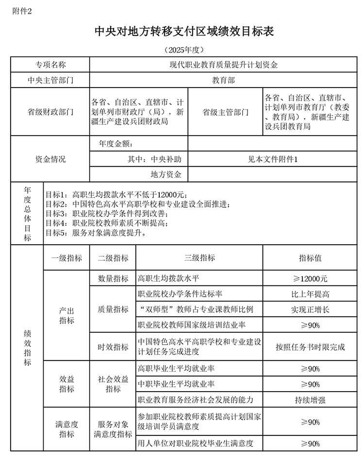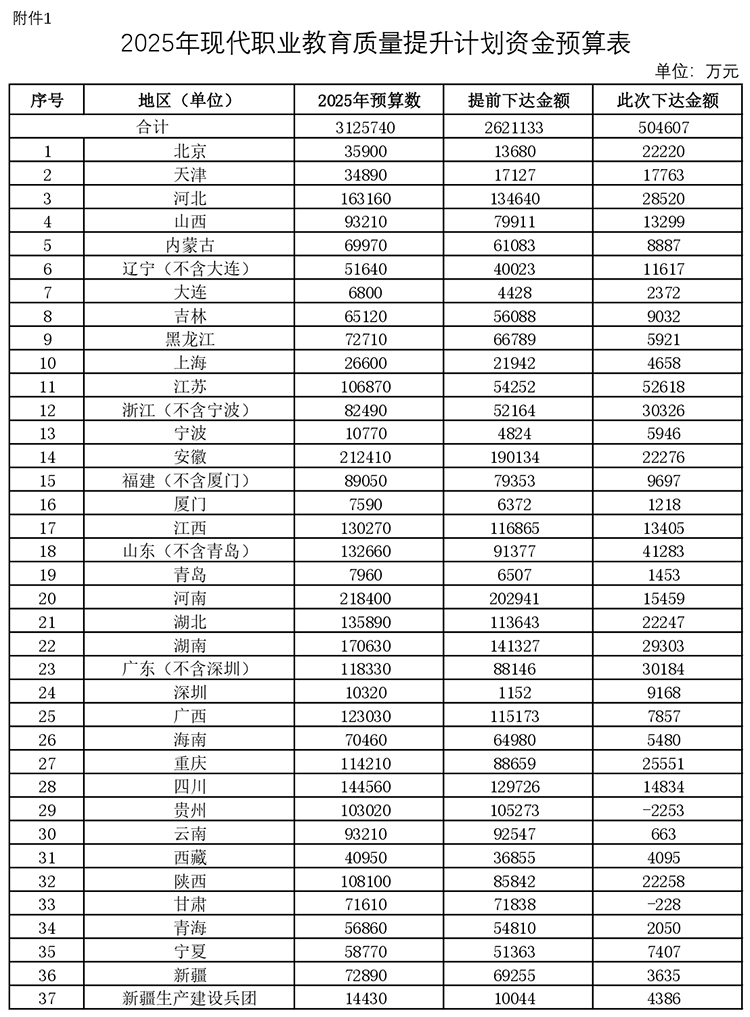 為貫徹落實中共中央和國務院印發(fā)的《教育強國建設規(guī)劃綱要(2024—2035年)》、中央辦公廳和國務院辦公廳印發(fā)的《關于深化現(xiàn)代職業(yè)教育體系建設改革的意見》等有關精神,經(jīng)研究,現(xiàn)核定下達你省(自治區(qū)、直轄市、計劃單列市、新疆生產(chǎn)建設兵團)2025年現(xiàn)代職業(yè)教育質量提升計劃資金預算(以下簡稱提升計劃資金,項目代碼:Z135050009055),詳見附件1。收入列2025年政府收支分類科目“1100245教育共同財政事權轉移支付收入”,支出列“205教育支出”?,F(xiàn)將有關事項通知如下: