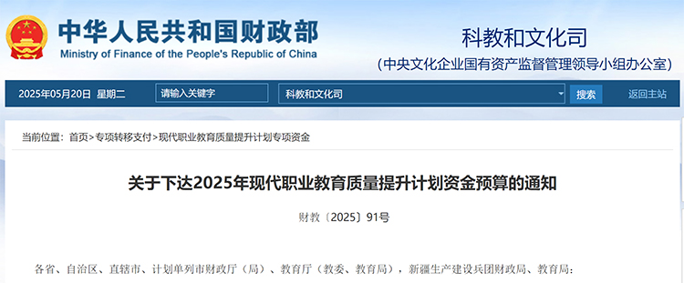 關于下達2025年現(xiàn)代職業(yè)教育質量提升計劃資金預算的通知 財教〔2025〕91號