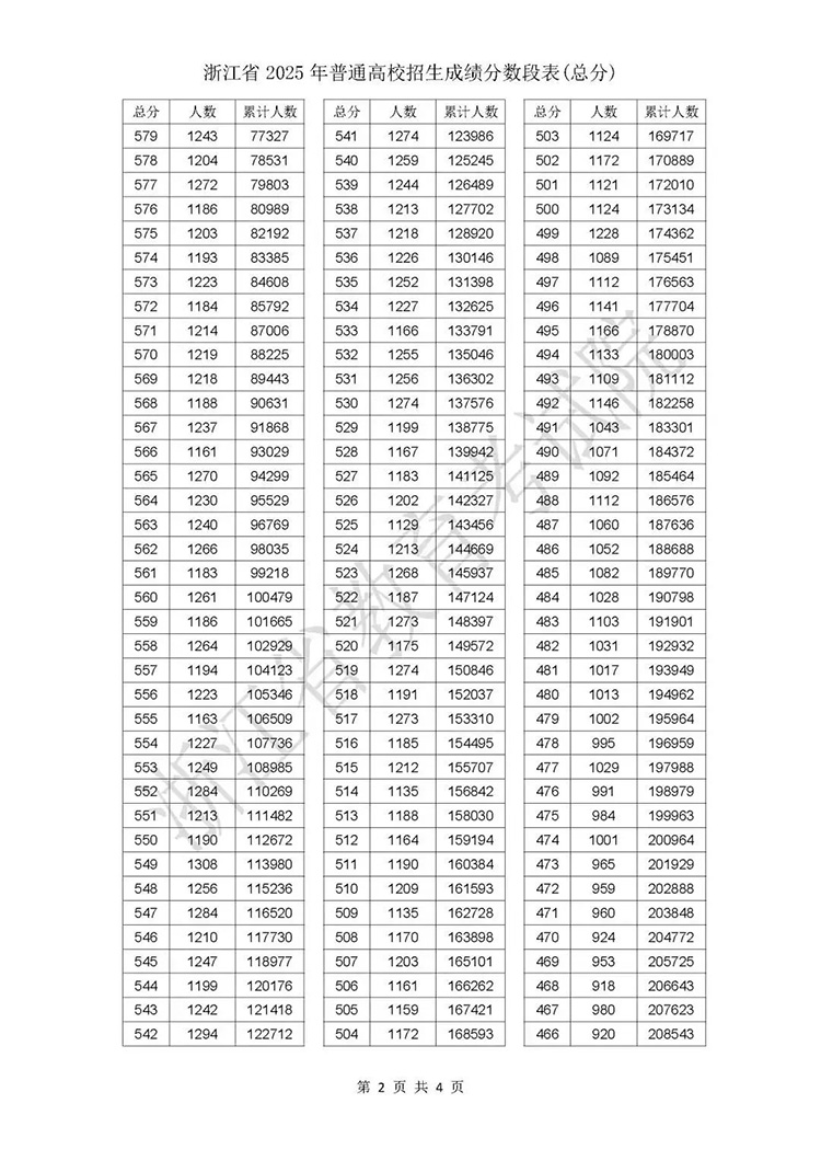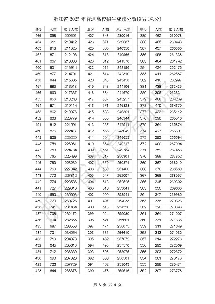 浙江省2025年普通高校招生成績分數(shù)段表(總分)