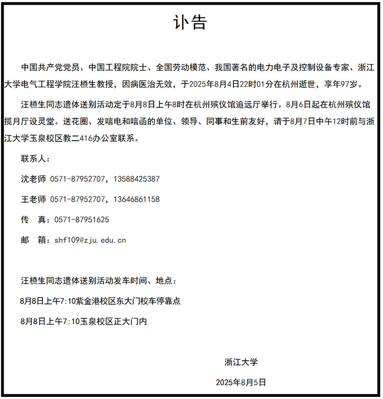 8月5日,浙江大學電氣工程學院發(fā)布訃告:中國共產(chǎn)黨黨員、中國工程院院士、全國勞動模范、我國著名的電力電子及控制設(shè)備專家、浙江大學電氣工程學院汪槱生教授,因病醫(yī)治無效,于2025年8月4日22時01分在杭州逝世,享年97歲。