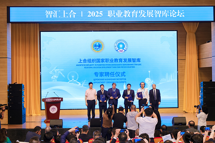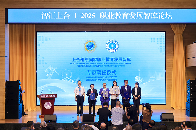 上合組織國家職業(yè)教育發(fā)展智庫專家聘任環(huán)節(jié),中國教育部課程教材研究所副所長曾天山,天津教育委員會副主任羅延安,天津職業(yè)技術(shù)師范大學(xué)校務(wù)委員會主席張金剛,天津職業(yè)技術(shù)師范大學(xué)校長鄭清春,中國教育部魯班工坊建設(shè)專家委員會主任呂景泉,天津職業(yè)技術(shù)師范大學(xué)黨委副書記李靖為智庫專家頒發(fā)聘書。