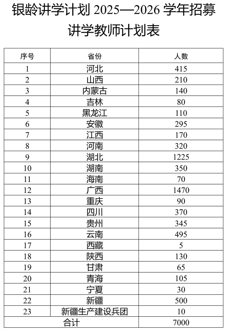 (二)招募人數(shù)。2025年義務教育階段計劃招募7000名講學教師(見附件)。在此基礎上,鼓勵各省份和兵團結合實際,面向其他比較薄弱縣鄉(xiāng)地區(qū)和教育發(fā)展欠發(fā)達區(qū)域自主選拔優(yōu)秀退休教師開展講學,可酌情將普通高中納入實施范圍。