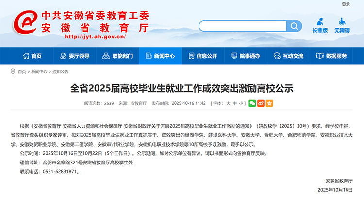 近日,安徽省教育廳發(fā)布《全省2025屆高校畢業(yè)生就業(yè)工作成效突出激勵高校公示》。經(jīng)學校申報,省教育廳牽頭組織專家評審,擬對2025屆高校畢業(yè)生就業(yè)工作真抓實干、成效突出的巢湖學院、蚌埠醫(yī)科大學、安徽大學、合肥大學、合肥師范學院、安徽職業(yè)技術(shù)大學、安徽財貿(mào)職業(yè)學院、安徽第二醫(yī)學院、安徽審計職業(yè)學院、安徽機電職業(yè)技術(shù)學院等10所高校予以激勵,現(xiàn)予以公示。