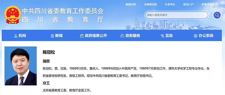 據(jù)中共四川省委教育工作委員會(huì)、四川省教育廳網(wǎng)站10月20日更新消息,陳冠松已任中共四川省委教育工委書(shū)記,教育廳黨組書(shū)記,主持省委教育工委、教育廳全面工作。