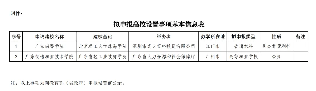 根據(jù)公示信息,擬申報(bào)的廣東南粵學(xué)院由深圳市光大策略投資有限公司舉辦,為民辦非營(yíng)利性普通本科院校;廣東制造職業(yè)技術(shù)學(xué)院由廣東省人力資源和社會(huì)保障廳舉辦,為公辦性質(zhì)高等職業(yè)學(xué)校。