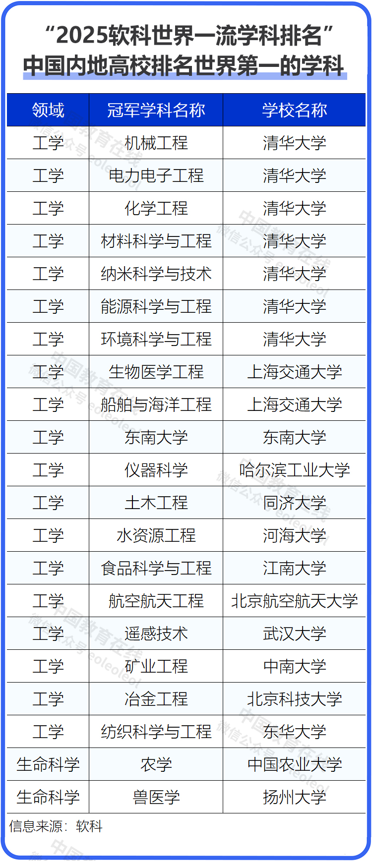 2025軟科世界一流學科排名中,中國內(nèi)地高校在電力電子工程、生物醫(yī)學工程、材料科學與工程3個學科首度問鼎世界第一,使得中國內(nèi)地高校的全球冠軍學科增加到21個。分別是清華大學(機械工程、電力電子工程、化學工程、材料科學與工程、納米科學與技術(shù)、能源科學與工程、環(huán)境科學與工程)、上海交通大學(生物醫(yī)學工程、船舶與海洋工程)、東南大學(通信工程)、哈爾濱工業(yè)大學(儀器科學)、同濟大學(土木工程)、河海大學(水資源工程)、江南大學(食品科學與工程)、北京航空航天大學(航空航天工程)、武漢大學(遙感技術(shù))、中南大學(礦業(yè)工程)、北京科技大學(冶金工程)、東華大學(紡織科學與工程)、中國農(nóng)業(yè)大學(農(nóng)學)、揚州大學(獸醫(yī)學)。其中,揚州大學首次擁有全球冠軍學科。