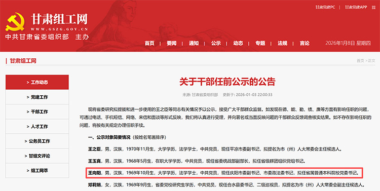日前,甘肅省委組織部發(fā)布干部任前公示的公告。公示提到:王向陽,男,漢族,1969年10月生,大學學歷,法學學士,中共黨員,現(xiàn)任慶陽市委副書記、市委政法委書記,擬任省屬普通本科院校黨委書記。