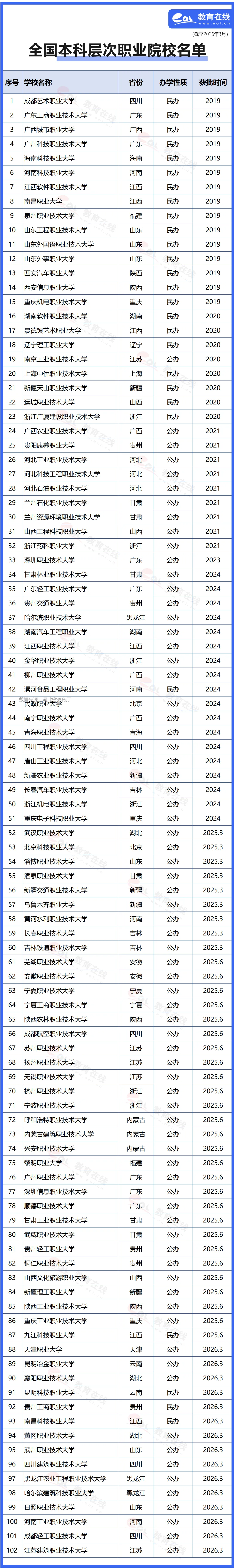 至此,全國職業(yè)本科高校超過百所,共計(jì)102所。