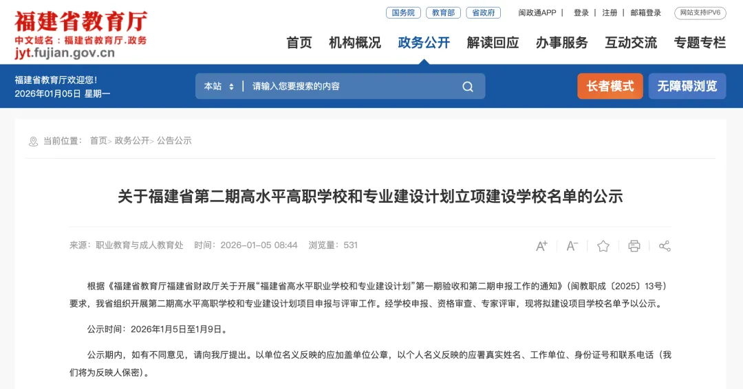 根據(jù)《福建省教育廳福建省財(cái)政廳關(guān)于開展“福建省高水平職業(yè)學(xué)校和專業(yè)建設(shè)計(jì)劃”第一期驗(yàn)收和第二期申報(bào)工作的通知》(閩教職成〔2025〕13號(hào))要求,我省組織開展第二期高水平高職學(xué)校和專業(yè)建設(shè)計(jì)劃項(xiàng)目申報(bào)與評(píng)審工作。經(jīng)學(xué)校申報(bào)、資格審查、專家評(píng)審,現(xiàn)將擬建設(shè)項(xiàng)目學(xué)校名單予以公示。公示時(shí)間:2026年1月5日至1月9日。根據(jù)公示名單,20所高校入選高水平高職學(xué)校擬立項(xiàng)建設(shè)單位,20所高校入選高水平專業(yè)群擬立項(xiàng)建設(shè)單位。