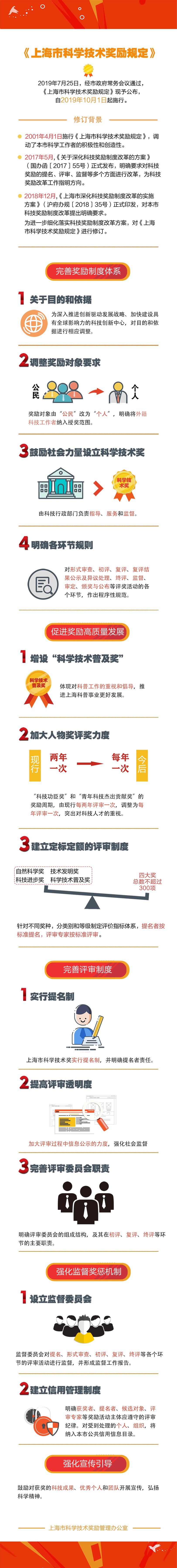 《上海市科學技術(shù)獎勵規(guī)定》自2001年4月1日起施行以來,對調(diào)動本市科技工作者的積極性和創(chuàng)造性發(fā)揮了重要作用。按照《關(guān)于深化科技獎勵制度改革的方案》(國辦函〔2017〕55號)要求,上海開展了本市科技獎勵制度改革工作,并于2018年出臺了《上海市深化科技獎勵制度改革的實施方案》。為進一步細化落實改革方案,按照市政府立法工作計劃,市科委會同市司法局開展了《規(guī)定》的相關(guān)修訂工作。修訂后的《規(guī)定》經(jīng)2019年7月25日市政府第59次常務會議通過,現(xiàn)正式公布啦,將于2019年10月1日起施行。