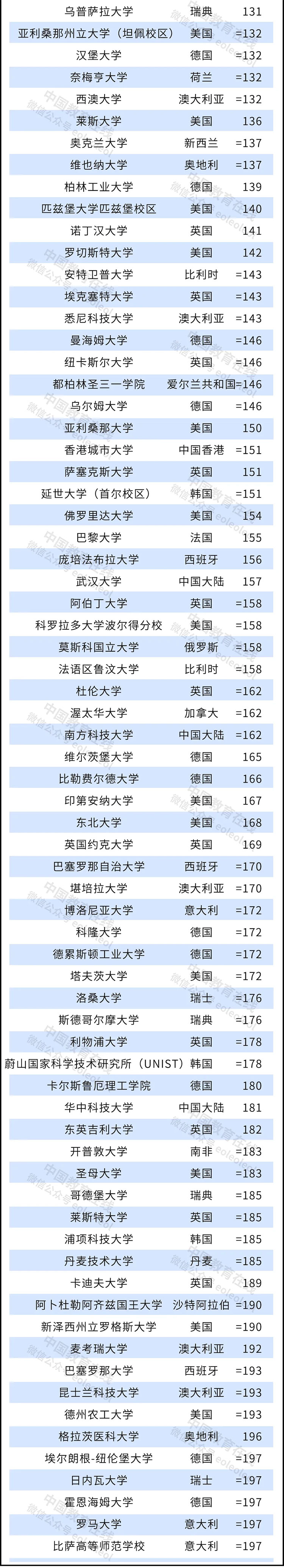 武漢大學(第 157 名)、南方科技大學(第 162名)和華中科技大學(第 181 名)為首次進入前200名的高校。