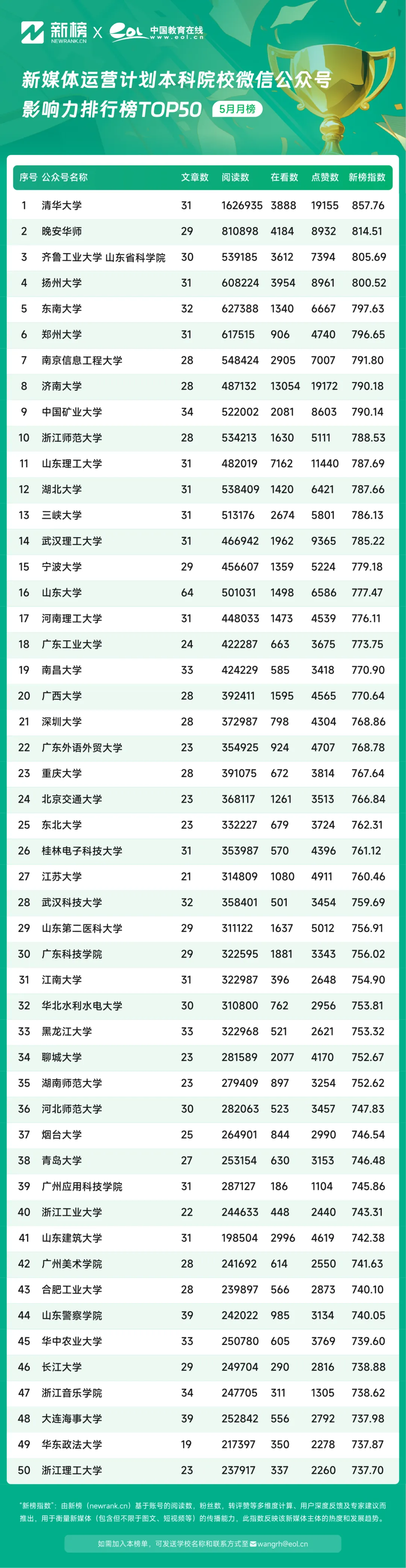 5月,中國教育在線新媒體運(yùn)營計劃本科院校微信公眾號影響力排行榜TOP50中,@清華大學(xué)公眾號憑借857.76的新榜指數(shù)躍居榜單第一,@晚安華師憑借814.51的影響力指數(shù)位居第二,@齊魯工業(yè)大學(xué)以805.69的影響力指數(shù)位居榜單第三。