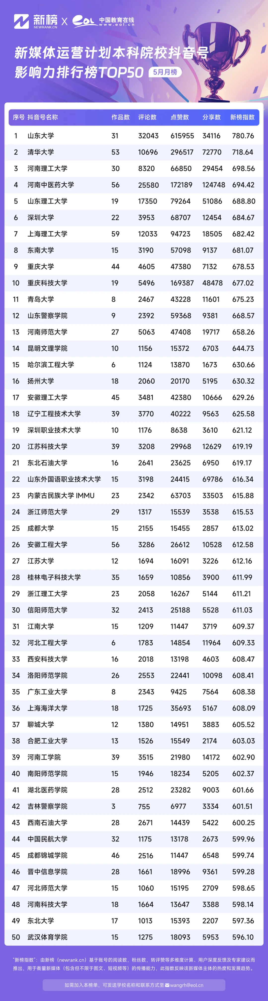 5月,中國教育在線新媒體運(yùn)營計劃本科院校微信抖音號影響力排行榜TOP50中,@山東大學(xué)抖音號憑借780.76的新榜指數(shù)躍居榜單第一,@清華大學(xué)憑借718.64的影響力指數(shù)位居第二,@河南理工大學(xué)以698.56的影響力指數(shù)位居榜單第三。