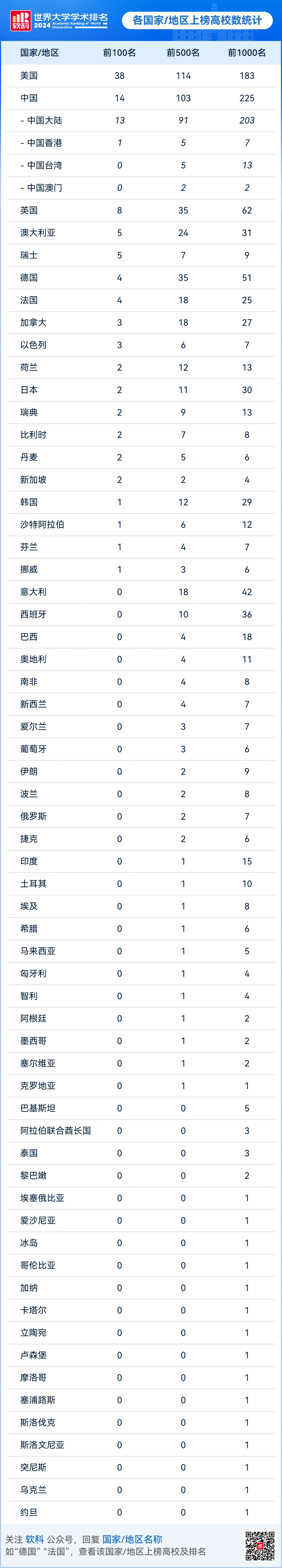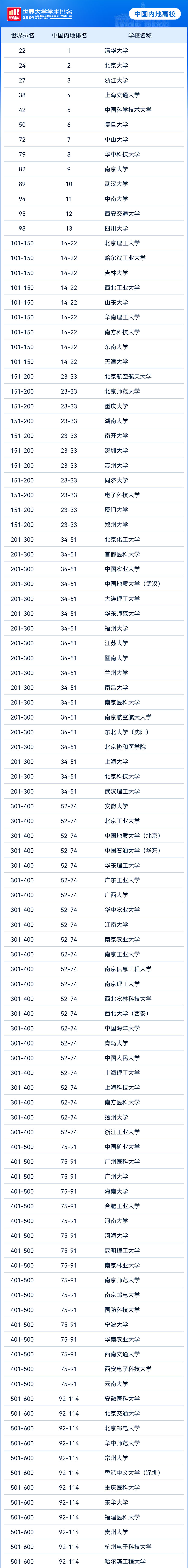 2024年8月15日,軟科正式發(fā)布“2024軟科世界大學(xué)學(xué)術(shù)排名”。排名展示了全球領(lǐng)先的1000所研究型大學(xué),中國內(nèi)地共有203所大學(xué)上榜,其中13所位列世界百強(qiáng),比去年增加3所。清華大學(xué)排名全球第22,位列亞洲第一。北京大學(xué)排名第24,浙江大學(xué)排名第27,上海交通大學(xué)排名第38。中國科學(xué)技術(shù)大學(xué)(42名)和復(fù)旦大學(xué)(50名)首次進(jìn)入全球50強(qiáng)。中山大學(xué)(72名)、華中科技大學(xué)(79名)、南京大學(xué)(82名)、武漢大學(xué)(89名)、中南大學(xué)(94名)、西安交通大學(xué)(95名)、四川大學(xué)(98名)躋身全球百強(qiáng)。湖北大學(xué)、對外經(jīng)濟(jì)貿(mào)易大學(xué)、蘭州理工大學(xué)等20所中國內(nèi)地高校首次上榜,顯示出中國大學(xué)的學(xué)術(shù)水平和國際影響力正在持續(xù)攀升。