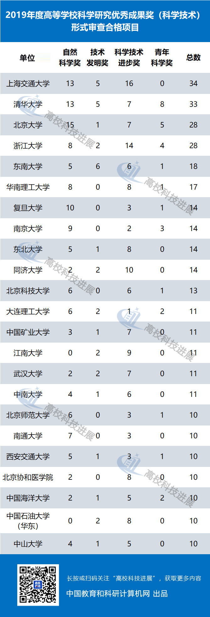 科學(xué)技術(shù)進(jìn)步獎(jiǎng)共有422項(xiàng)(通用項(xiàng)目406項(xiàng),專用項(xiàng)目16項(xiàng))形式審查合格。在通用項(xiàng)目的統(tǒng)計(jì)結(jié)果中,共有167所高校以第一完成單位牽頭的項(xiàng)目通過審查。形式審查合格項(xiàng)目較多的高校分別是上海交通大學(xué)16項(xiàng),浙江大學(xué)14項(xiàng),同濟(jì)大學(xué)10項(xiàng),江南大學(xué)9項(xiàng),北京協(xié)和醫(yī)學(xué)院、東北大學(xué)和中國石油大學(xué)(華東)均為8項(xiàng),北京大學(xué)、清華大學(xué)、武漢大學(xué)和中國礦業(yè)大學(xué)各有7項(xiàng),北京科技大學(xué)、東南大學(xué)、中南大學(xué)、首都醫(yī)科大學(xué)、江蘇大學(xué)分別有6項(xiàng),北京林業(yè)大學(xué)、中國礦業(yè)大學(xué)(北京)、中國醫(yī)科大學(xué)、河海大學(xué)、中國海洋大學(xué)、華中科技大學(xué)、中山大學(xué)、華南理工大學(xué)、中國人民解放軍海軍軍醫(yī)大學(xué)以及五邑大學(xué)各有5項(xiàng)。