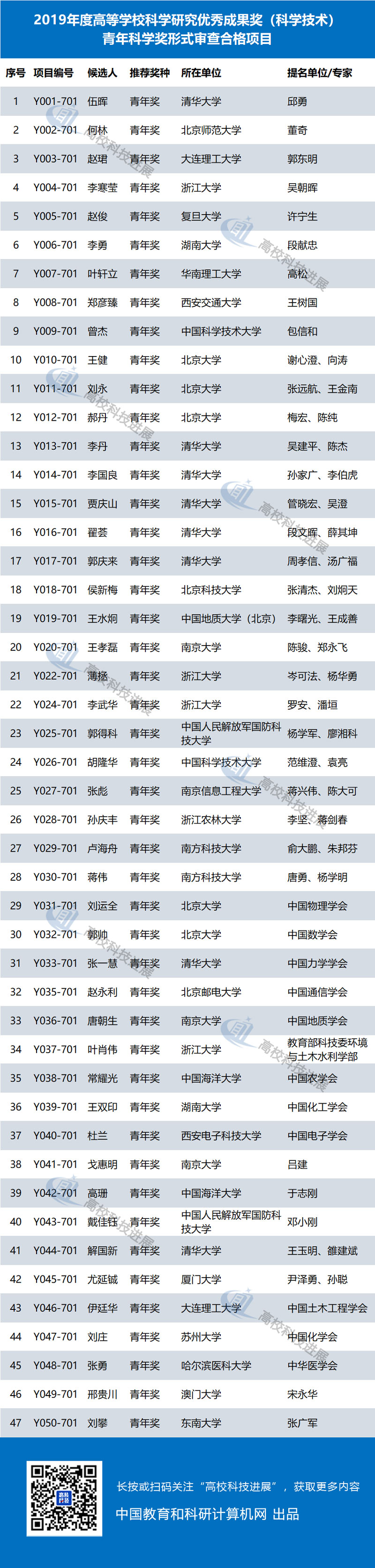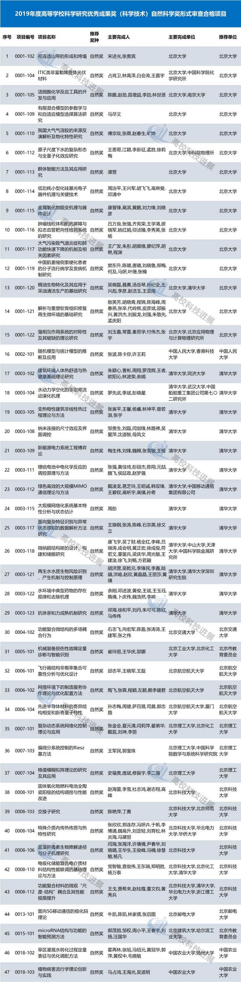7月22日,2019年度高等學(xué)??茖W(xué)研究?jī)?yōu)秀成果獎(jiǎng)(科學(xué)技術(shù))推薦/提名工作已結(jié)束。教育部科技司組織對(duì)候選項(xiàng)目/候選人進(jìn)行了形式審查,確定形式審查合格941項(xiàng)/人(含專用項(xiàng)目32項(xiàng)),不合格92項(xiàng),形式審查過程中,推薦/提名單位或?qū)<姨岢龀蜂N推薦/提名13項(xiàng)。形式審查合格項(xiàng)目中,自然科學(xué)獎(jiǎng)347項(xiàng),技術(shù)發(fā)明獎(jiǎng)125項(xiàng)(通用項(xiàng)目109項(xiàng),專用項(xiàng)目16項(xiàng)),科學(xué)技術(shù)進(jìn)步獎(jiǎng)422項(xiàng)(通用項(xiàng)目406項(xiàng),專用項(xiàng)目16項(xiàng)),青年科學(xué)獎(jiǎng)候選人47人。