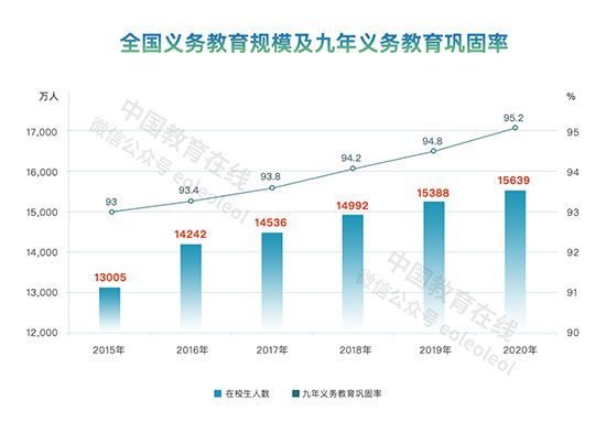 2015年,全國共有義務(wù)教育階段在校生1.3億人,義務(wù)教育鞏固率為93%,到2020年,全國共有義務(wù)教育階段在校生1.56億人,九年義務(wù)教育鞏固率95.2%,比2015年提高了2.2個百分點。