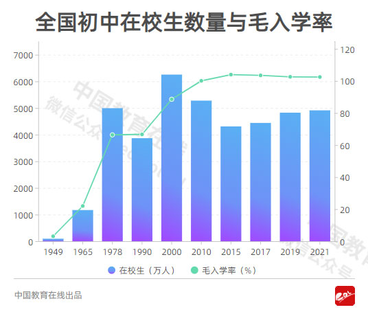 建國初期的中國,中學(xué)在校生不超過100萬人,為95萬人,毛入學(xué)率3.1%。1978年,全國初中在校生人數(shù)達到4995萬人,毛入學(xué)率66.4%。