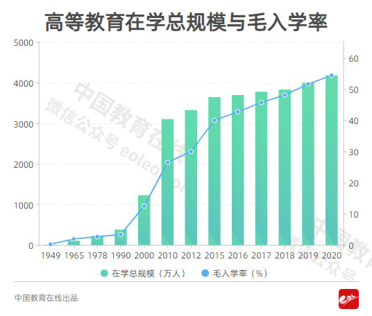 隨著高校的進一步擴招,全國高等教育總規(guī)模在之后幾年又迅速增長,2010年已達到3105萬人。2014年,在校生規(guī)模達到3559萬人,居世界第一。2020年,全國各類高等教育在學(xué)總規(guī)模達到4183萬人。