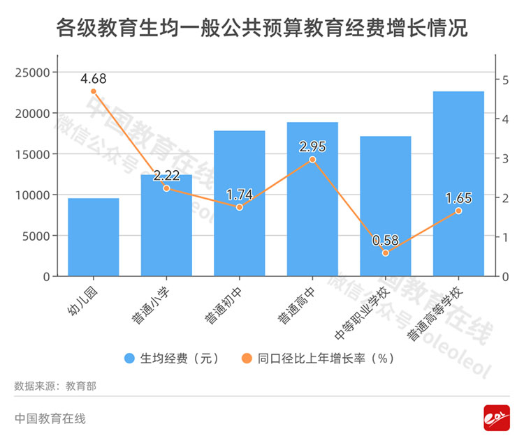 其中,增長最快的是幼兒園,比上一年增長4.68%,達(dá)到了9505.84元。普通小學(xué)為12380.73,同比增長2.22%,普通初中為17772.06,同比增長1.74%,普通高中18808.71,同比增長2.95%,中職與普通高校增長最低,分別為17095.26與22586.42,僅增長0.58%和1.65%。