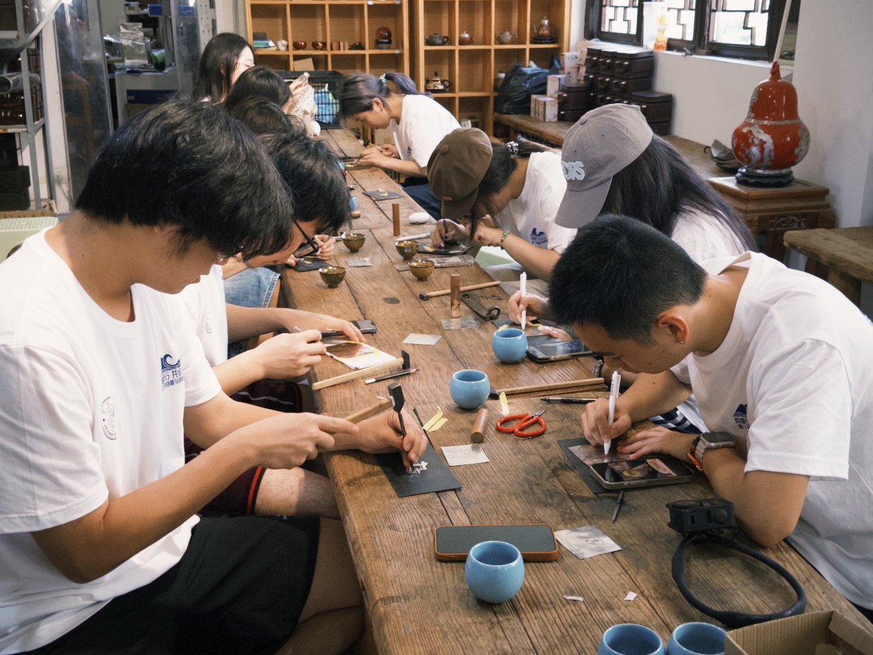 圖為隊員們在省級非遺-錫鑲工藝基地體驗鏨刻錫鑲紋樣,并將“精致城市”元素融入錫鑲設計,開發(fā)出系列文創(chuàng)產(chǎn)品。吳雅思 供圖