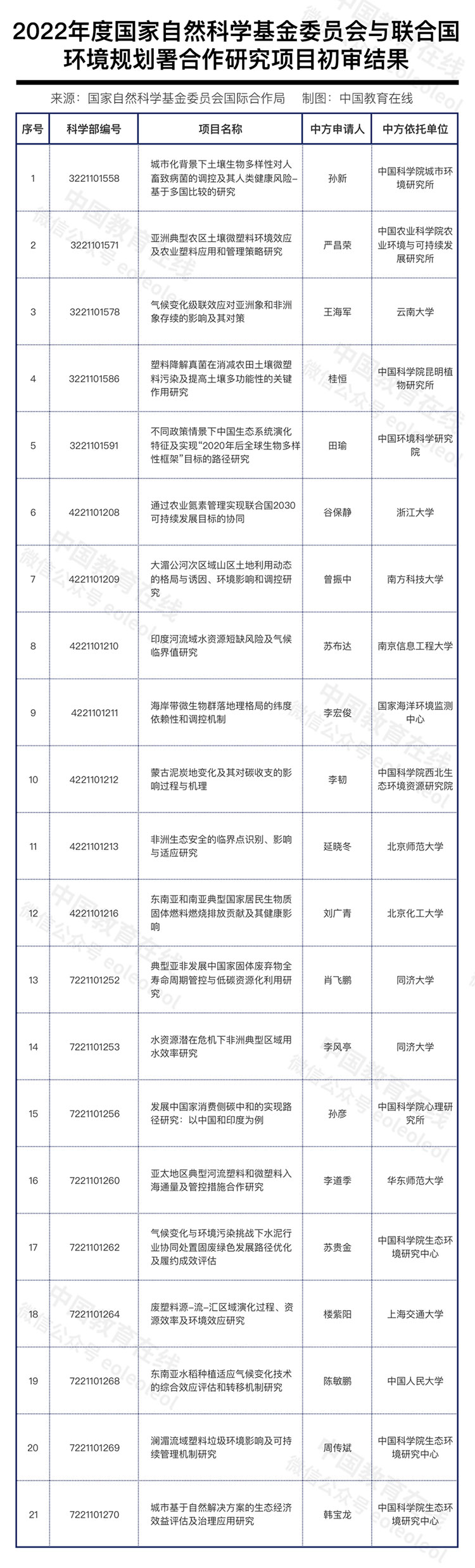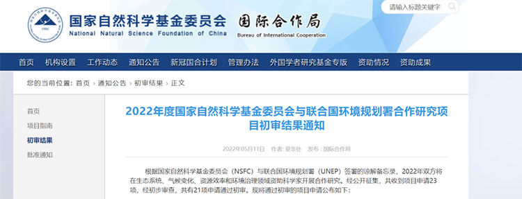 5月11日,國家自然科學(xué)基金委員會(huì)發(fā)布《2022年度國家自然科學(xué)基金委員會(huì)與聯(lián)合國環(huán)境規(guī)劃署合作研究項(xiàng)目初審結(jié)果通知》。云南大學(xué)、浙江大學(xué)、上海交通大學(xué)等單位申請(qǐng)的共21項(xiàng)申請(qǐng)通過初審。