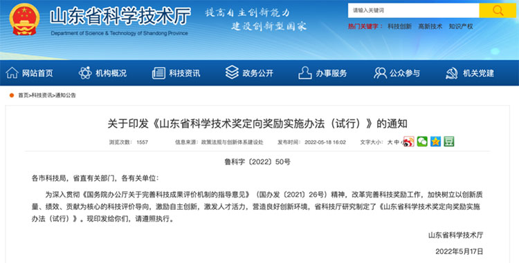 近年來,山東省持續(xù)深化科技獎勵制度改革,2018年出臺《山東省深化科技獎勵制度改革實(shí)施方案》,2020年出臺《山東省科學(xué)技術(shù)進(jìn)步獎產(chǎn)業(yè)突出貢獻(xiàn)類項(xiàng)目管理辦法》,在全國率先開展科技獎勵“懸賞制”改革,對市場份額高、引領(lǐng)行業(yè)發(fā)展成果按程序直接授予省科技進(jìn)步一等獎。山東省科技獎勵改革得到社會各界特別是科技界充分肯定,2021年11月,科技部等十部門聯(lián)合印發(fā)《關(guān)于組織開展科技成果評價(jià)改革試點(diǎn)工作的通知》,明確山東省作為全國唯一省份開展科技獎勵改革試點(diǎn)。