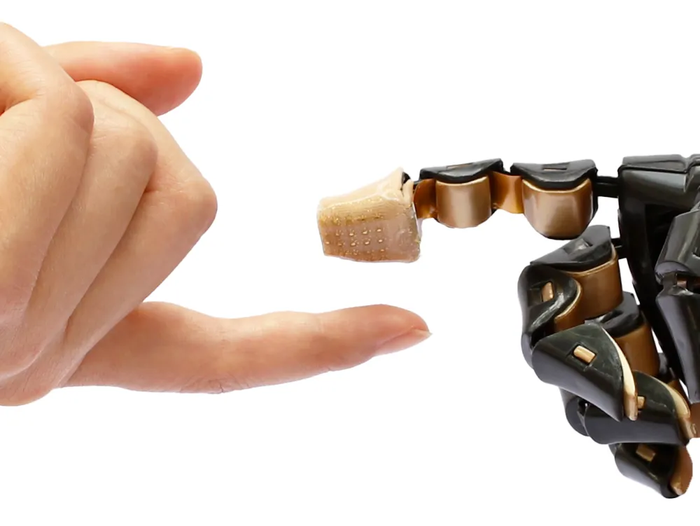 圖為裝有仿生三維電子皮膚的機(jī)械手與人手互動。(受訪者供圖)