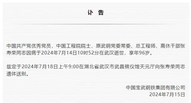 根據(jù)中國(guó)寶武鋼鐵集團(tuán)有限公司消息,中國(guó)共產(chǎn)黨優(yōu)秀黨員,中國(guó)工程院院士,原武鋼黨委常委、總工程師、離休干部張壽榮同志因病于2024年7月14日10時(shí)52分在武漢逝世,享年96歲。