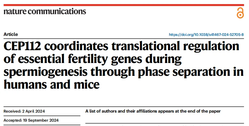 近日,華西二院生殖遺傳與表觀遺傳實(shí)驗(yàn)室許文明團(tuán)隊(duì)和中信湘雅生殖與遺傳??漆t(yī)院譚躍球團(tuán)隊(duì)合作在Nature Communications上發(fā)表了題為CEP112 Coordinates Translational Regulation of Essential Fertility Genes During Spermiogenesis Through Phase Separation in Humans and Mice的研究論文。這項(xiàng)研究揭示了中心體蛋白112(CEP112)在精子形成過程中的關(guān)鍵作用,并為男性不育的分子機(jī)制提供了新的見解。