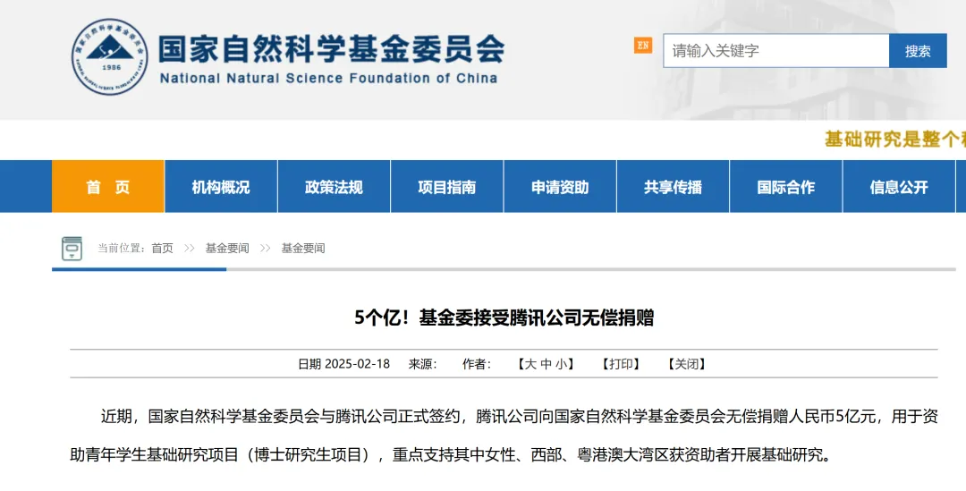 國家自然科學基金委員會消息,近期,國家自然科學基金委員會與騰訊公司正式簽約,騰訊公司向國家自然科學基金委員會無償捐贈人民幣5億元,用于資助青年學生基礎研究項目(博士研究生項目),重點支持其中女性、西部、粵港澳大灣區(qū)獲資助者開展基礎研究。