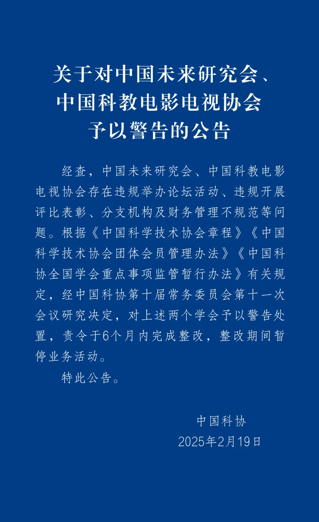 中國科協(xié):對中國未來研究會、中國科教電影電視協(xié)會予以警告